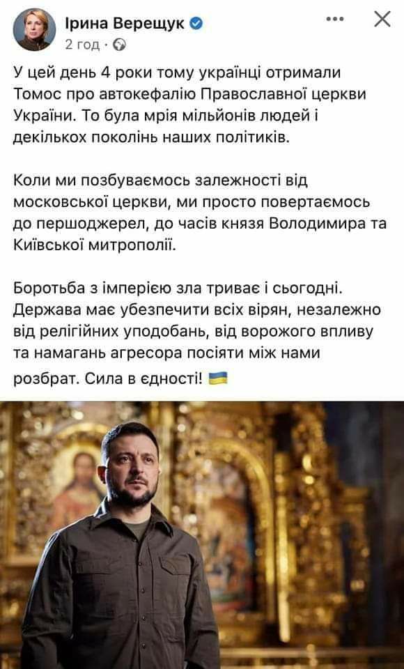 спочатку вона пише що Томос отримали "українці". Але це невірно навіть суто формально. Бо Томос це документ що надається одним патріархом до іншого патріарху, від матері-церкви надається документ про незалежність (автокефалію) до голови підлеглої церкви, а не якимось абстрактним "українцям". Ну а не формально, нагадайте будь ласка що саме українці зробили для незалежності своєї церкви окрім плювків в спину Порошенкові?
