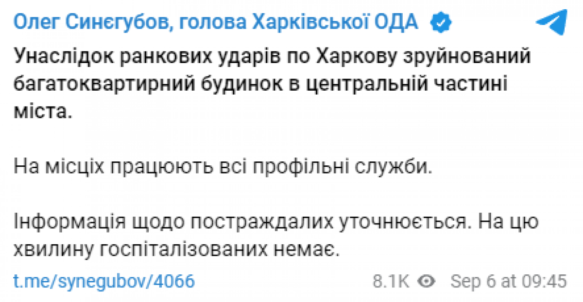 "В результате утренних ударов по Харькову разрушен многоквартирный дом в центральной части города. На местах работают все профильные службы. Информация о пострадавших уточняется. На данный момент госпитализированных нет", - подчеркнул Синегубов.