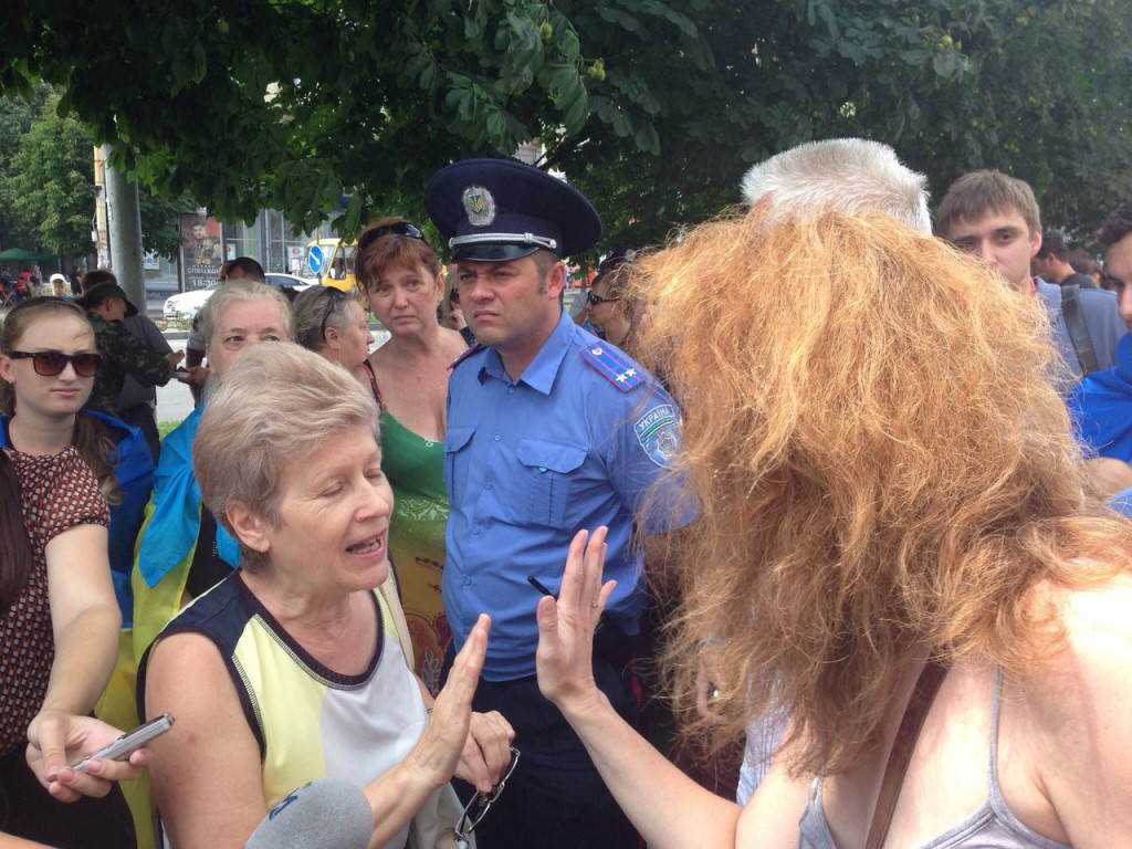 Также к мэрии пришли горожане с национальнойсимволикой. Они пели гимн Украины и народный хит «Путин — х..ло», а также в грубой форме пытались выгнать оппонентов. Активистов было около 50 человек.