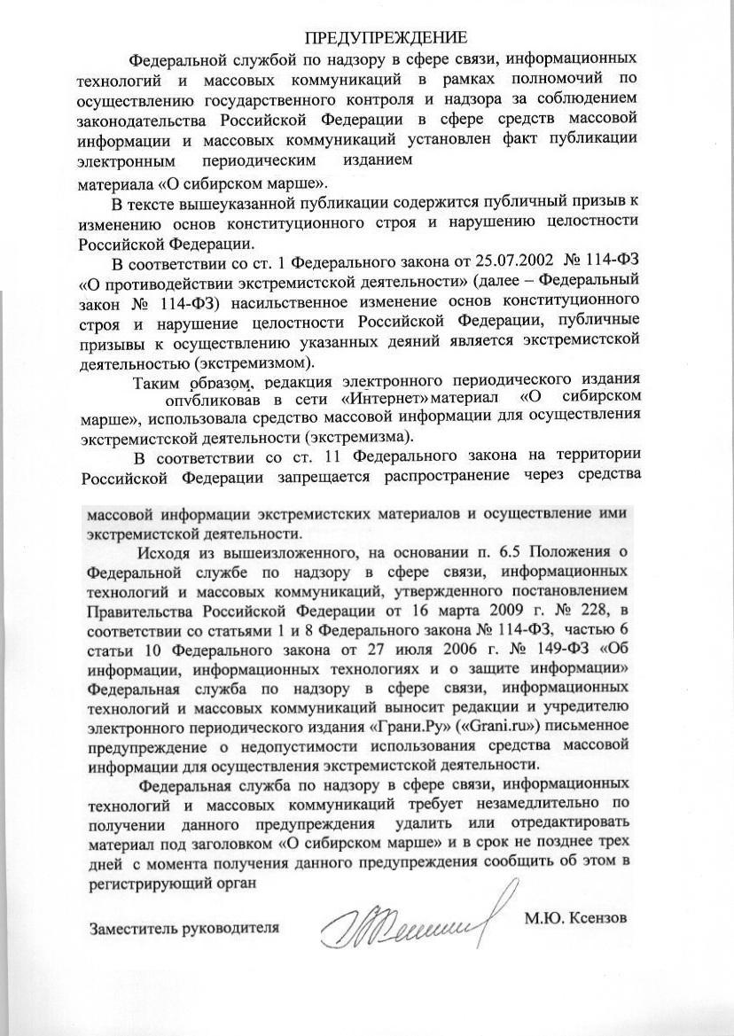 Відомство знайшло в їхніх матеріалах заклики до участі у протиправних заходах. Як зазначає "Коммерсант", мова йде про публікації, присвячені "Маршу за федералізацію Сибіру".