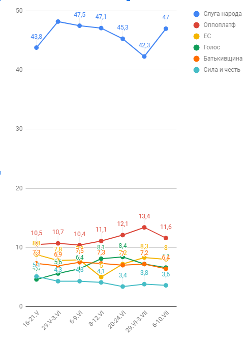 Лидером электоральных симпатий среди политических сил является партия «Слуга народа», которую готовы поддержать 47% тех, кто намерен голосовать и определился с симпатиями. Также, пока, преодолевают проходной барьер партия «Оппозиционная платформа - За життя» (11,6%), партия «Европейская Солидарность» (8,2%), партия «Голос» (6,6%) и «Батькивщина» (6,4%). Партию «Сила и честь» готовы поддержать 3,6%, «Оппозиционный блок» - 3,2%, партию «Украинская стратегия Гройсмана» - 2,8%, Радикальную партию - 2,5%, партию ВО «Свобода» - 2,1%. Рейтинг других политических сил - менее 2%.