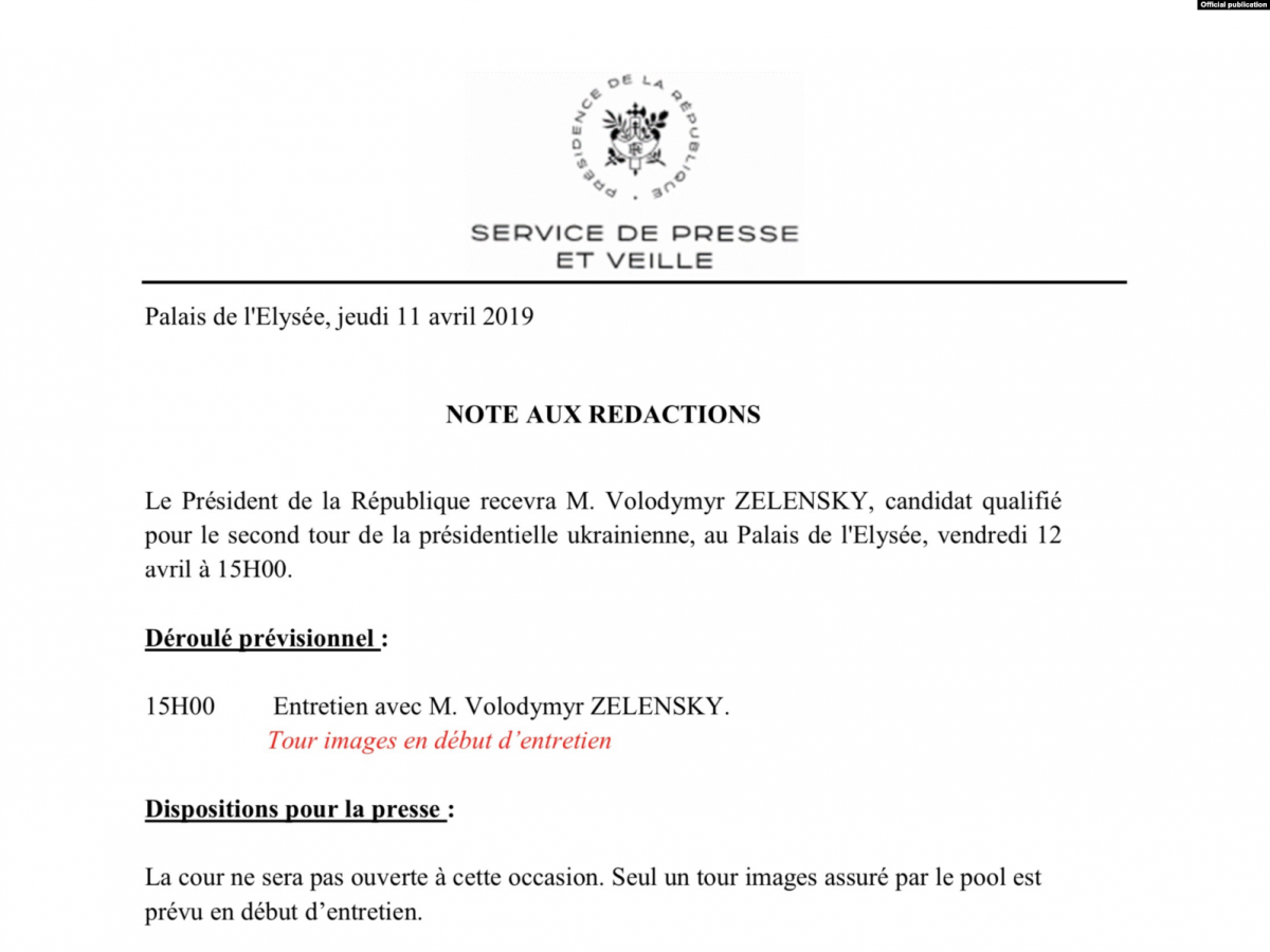 В Елисейском дворце подтвердили, что президент Франции Эммануэль Макрон в пятницу, 12 апреля, примет у себя двух кандидатов в президенты Украины - шоумена Владимира Зеленского и действующего главу государства Петра Порошенко.