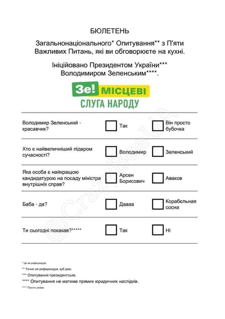 Ініційоване Президентом загальнонаціональне опитування не тотожне референдуму. Результат голосування 25 жовтня 2020 року у форматі такого опитування не матиме прямих юридичних наслідків. Застосування такої форми безпосередньої демократії потрібне для того, щоб зафіксувати волю народу і вже з цим політичним мандатом вибудовувати державні позиції.