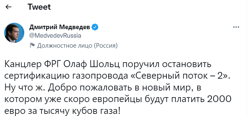 "Вчора Росія вирішила визнати суверенітет двох "народних республік" Донбасу. Відразу хочу сказати, ми бачимо спекуляції на цю тему, на тему того, що Росія збирається відновити імперію, в імперських же кордонах. Це абсолютно не відповідає дійсності", - сказав президент країни-окупанта. Джерело: https://censor.net/ua/v3318037