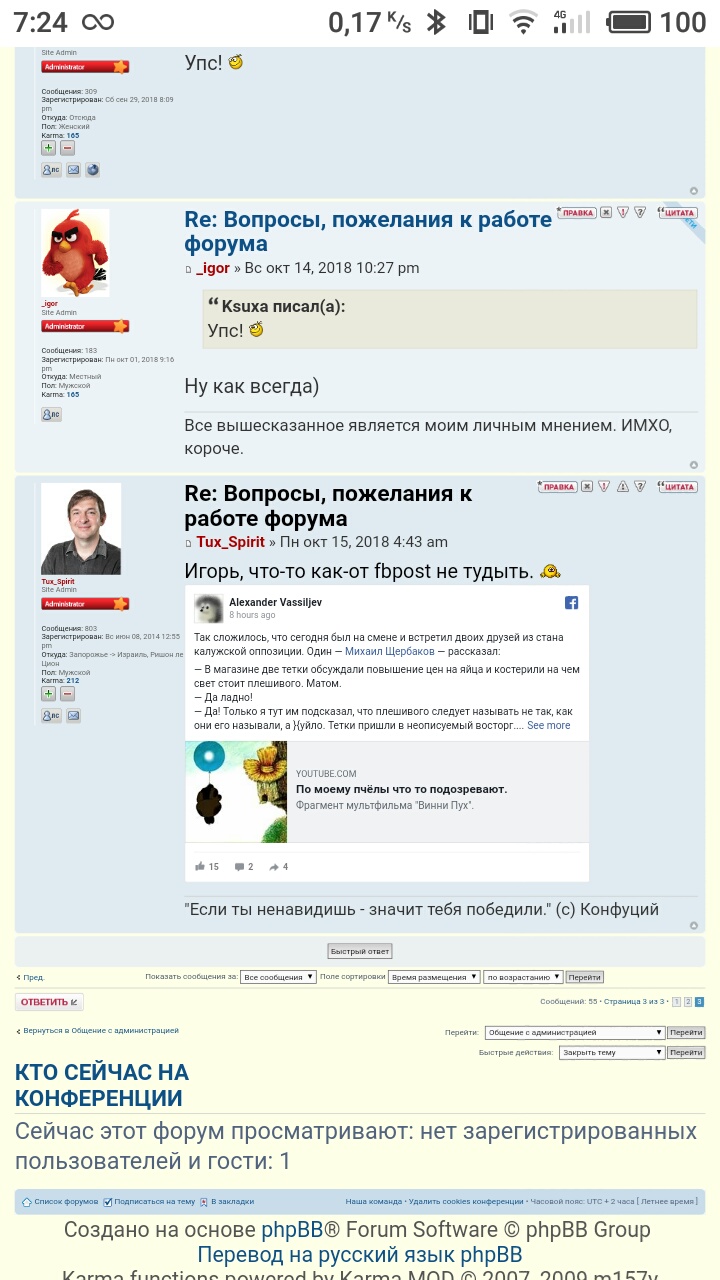 Tux_Spirit писал(а):Я повторю то же что писал Юлии в личку: на форуме должно быть комфортно всем, для этого написаны правила и существуют модераторы. Разрушать форум из-за капризов одного человека не будем. Всем добро пожаловать, но священных коров мы себе позволить тоже не можем.