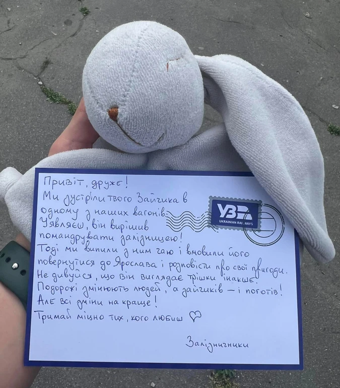 Не дивуйся, що він виглядає трішки інакше. Подорожі змінюють людей, а зайчиків – і поготів! Але всі зміни на краще! Тримай міцно тих, кого любиш", – написали залізничники.