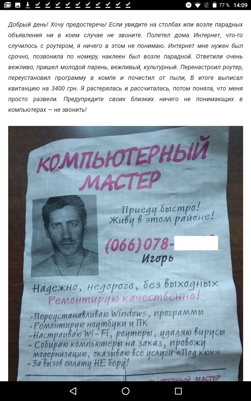 Уже не один год на стенах парадного можно увидеть объявления: Ремонт компьютера! Недорого! Почищу пыль, вирусы. И тут же фото обольстительно улыбающегося симпатичного мужчины. Кто догадливее тот сразу определял, что на фото американский актер. И покачав головой вызывали своего мастера.