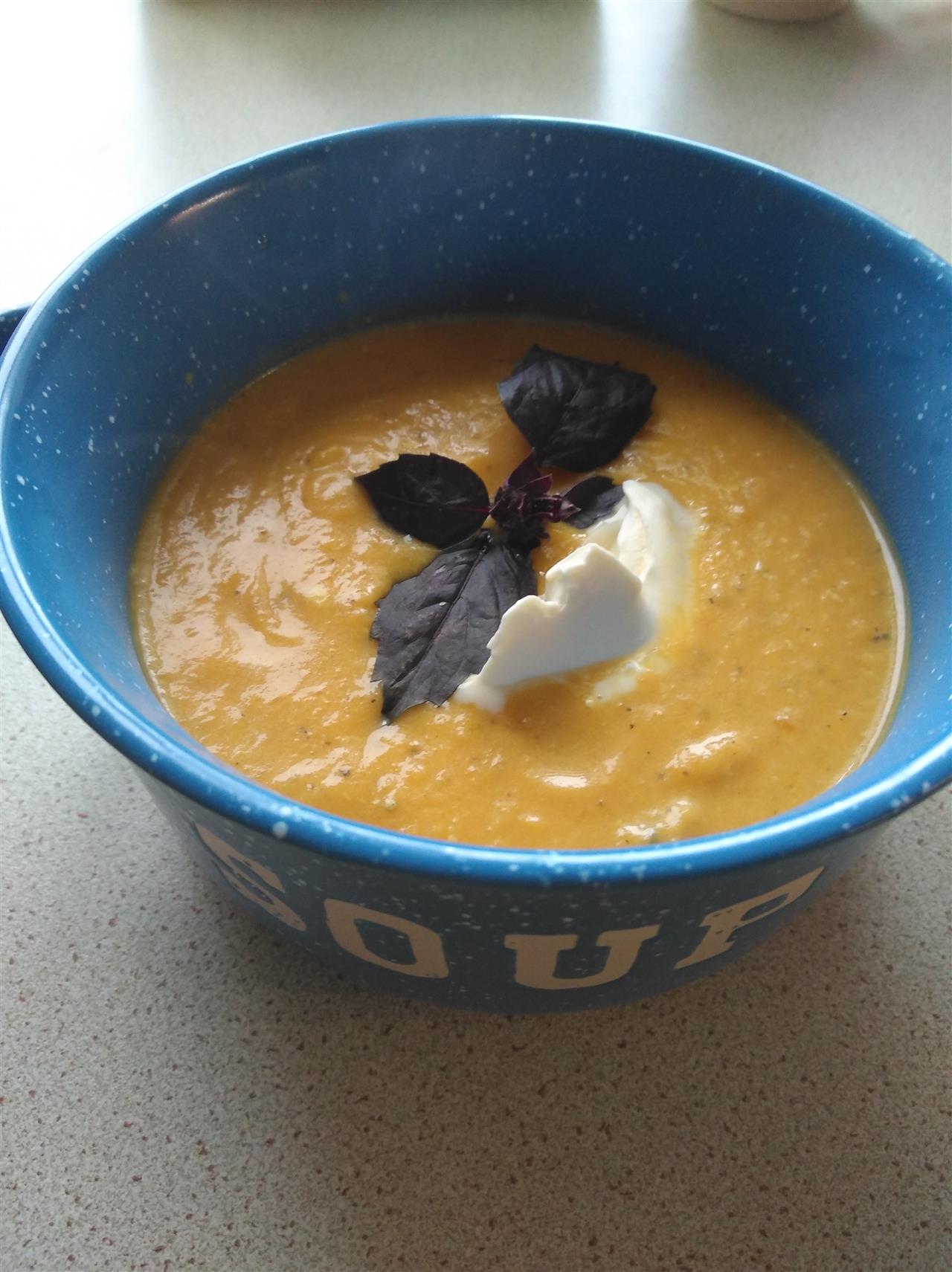 В казанке на донышко наливаем чуть растительного масла (лучше оливкового) ,жарим лучок, порезанный кубиками, туда же мелко порезанный чеснок - до мягкости. Сюда же порезанный кубиками (1см на 1 см) гарбуз. Обжариваем минут 5. Добавляем воды ,чуть чуть, чтоб даже не покрывала. Тушим минут 10 (до мягкости), солим, перчим, можно орегано добавить. Погружным блендером взбиваем до шелковистого состояния , наливаем сливки и ещё минут 5 провариваем. Усё))) Дитё просило добавки!!! Хотя застваить её сьесть первое - это для меня уже подвиг.