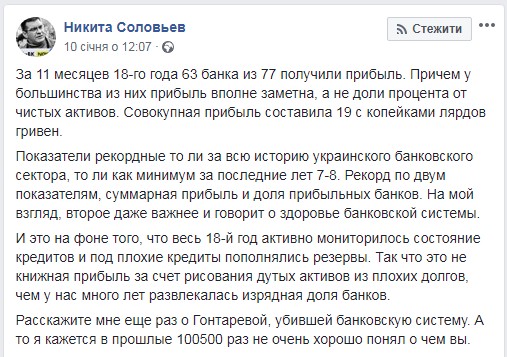 И кто такой Никита Соловьев, чтоб его пост в фейсбучике был представлен доказательством отличной работы банковской системы?