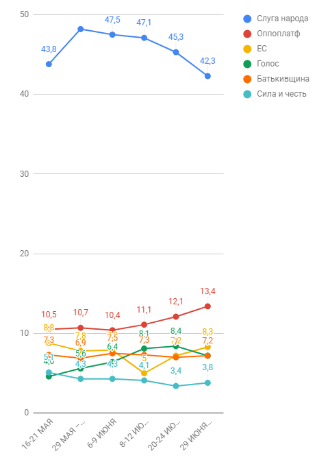 Сейчас пять политических партий преодолевают 5% проходной барьер и имеют шанс попасть в Верховную Раду 9 созыва.
